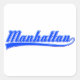 Manhattan, New York City, written with a swash (tail). Fonts in white and blue. Original text design.