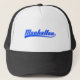 Manhattan, New York City, written with a swash (tail). Fonts in white and blue. Original text design.