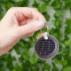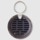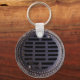 Cool manhole cover in a cobblestone road, befitting of a keychain. Antique metal grate set in grey stone. Personalization on back is optional.