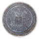 Features an antique manhole cover grate embellished with a crown and a phoenix, nestled in an old cobblestone road. Rustic and refined with old world charm.