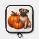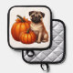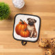 Illustration d'un carlin mignon assis à côté de citrouilles orange vifs, entouré de feuilles sur le thème de l'automne, symbolisant la célébration, le charme saisonnier et la chaleur dans une composition artistique et confortable.