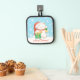 Chat blanc souriant dans un casquette de Noël rouge traditionnel tenant un grand cadeau emballé souhaite à chacun un très joyeux Noël ! Dans sa patte gauche, le chat tient haut une cloche dorée avec un arc vert.