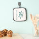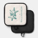 Ce potholder présente une conception estivale d'étoiles de mer qui se chevauchent au-dessus d'une ligne de séparation avec un détail de starburst, et un nom personnalisé ci-dessous, le tout en turquoise sur blanc.