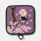 Illustration vectorielle d'une mignonne fille orientale en robe kimono rose/blanc clair avec un sous-vêtement rouge foncé. Les cheveux noirs de la fille sont décorés de fleurs et de épingles à cheveux de style geisha. Cette oeuvre a été inspirée par les poupées kokeshi traditionnelles du Japon et influencée par le style art Chibi Kawaii japonais. Le cerisier Sakura en fleurs fait un simple arrière - plan.
