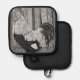 Roo était un coq de faverolle saumon et l'un des animaux les plus doux que j'ai eu. Il aimait être choyé et tenu, serrant tranquillement tout le temps. Il posait aussi souvent, ce qui en faisait un bon modèle. Le design pour ces porte-casseroles est un dessin de stylo que j'ai fait avec des stylos noirs et blancs sur du papier gris.