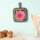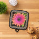 Apportez un peu de beauté à votre cuisine avec un porte-pot d'art contenant une photo d'un magnifique gazania entouré d'une frontière faite de motifs uniques trouvés dans l'écorce d'arbre. Les porte-billets font des cadeaux uniques pour votre hôte ou hôtesse préférée.