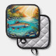 Illustration numérique colorée et détaillée d'une truite dans une rivière claire entourée d'une verdure éclatante et éclairée par un soleil doré, alliant sérénité naturelle et dynamisme artistique.