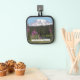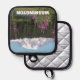 Servez-vous en toute sécurité des plateaux de cuisson, des plaques de cuisson et des casseroles du four avec ce porte-pot avec garniture noire qui présente une image photographique pittoresque de la neige enroulée du Mont Rainier et des fleurs sauvages d'algues roses dans le grand État du Nord-Ouest du Pacifique de l'État de Washington. Fait un grand cadeau souvenir de voyage! Sélectionnez le style de support de votre porte-pot.