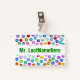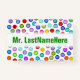 This badge design features lots of circles/dots of various colours. It also features a customizable name in green coloured text within a white coloured area. A badge like this could perhaps be worn by a teacher, educator, tutor or professor during the early weeks of a school year or a course. It might help the students learn and remember their teacher’s name. [~Z0000175]