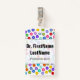 This badge design features lots of circles/dots of various colours. It also features a personalized name in black coloured text within a light coloured area. There is also a customizable message under the name that could show information such as a job title, or a profession, or a business/company name. [~Z0000176]