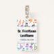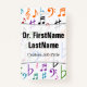 This badge design features a pattern involving various music notes and music notation symbols coloured a variety of colours. It also features a personalized name in black coloured text within a light coloured area. There is also a customizable message under the name that could show information such as a job title, or a profession, or a business/company name. [~Z0000176]