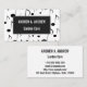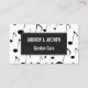 This business card design features a pattern of various sized music notes. It might be appreciated by a musician, a composer, a singer, or somebody else who really likes music. The front also features a dark-coloured rectangular shaped area containing a name and a profession/role/title/position that can both be personalized. The back features a simple design including a name, a profession/role/title/position, and contact details that can be personalized. This business card design could be used by a professional, or perhaps by a small business owner. [~Z0000061]