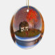 Inside a "snow globe" is an autumn landscape with a cottage overshadowed by maple and cherry trees. The surrounding field is filled with tall green and golden grass. Roses and ivy climb the wall of the little house. The maple tree is in brilliant fall colour, and instead of snow there are maples leaves in shades of red, orange, and yellow swirling around in the globe and blanketing the grass.