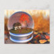Inside a "snow globe" is an autumn landscape with a cottage overshadowed by maple and cherry trees. The surrounding field is filled with tall green and golden grass. Roses and ivy climb the wall of the little house. The maple tree is in brilliant fall colour, and instead of snow there are maples leaves in shades of red, orange, and yellow swirling around in the globe and blanketing the grass.