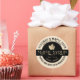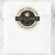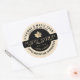 Personalize this maple syrup label with the business name, location, grade, and volume (list included of US and metric conversions for popular sizes). Central metallic gold maple in black circle. State name in curved text near bottom of label. Ivory background.