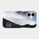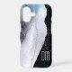This pretty phone case features a blue, gray, and silver faux glitter abstract agate like pattern on the left side, and your monogram in matching silver against a black background on the right. An overlay of tiny silver and blue confetti adds interest and sparkle. Unique and elegant!