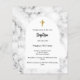 A white arch frame and marble print as background. A golden cross. Personalize and add a name and details.