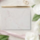 This elegant envelope, recommended for a modern wedding invitation, but that can be used on any occasion, especially for invitations, has white marble texture outside, faux metal copper texture inside and the return address printed with red-brown letters like the colour of the copper, the Name being written in an elegant calligraphic script.