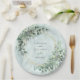 Perfect for nature themed weddings, these elegant watercolor botanical paper plates feature bouquets of eucalyptus greenery decorating the gold geometric frame around the names of the bride and groom and the wedding date. The background is an elegant marble texture.