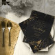 An abstract background reminiscent of marble in shades from charcoal grey to black veined with glittering gold is the backdrop for elegant script text and modern design layouts in the pieces of this beautiful wedding suite. The wedding invitation shown here features the above plus optional flowing script text of 'wedding' and a template to add your pertinent wedding details. Search ID644 to see all the coordinating pieces in this set.