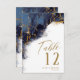 An abstract background reminiscent of marble in shades of navy blue veined with glittering gold is the backdrop for elegant script text and modern design layouts in the pieces of this beautiful wedding suite. The wedding table number card shown here features the above plus optional flowing script text of Table' and a template to add the bride and groom's names and wedding date. Search ID644 to see all the coordinating pieces in this set.