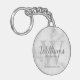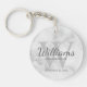 This keychain features personalized groomsman's name in grey classic script font style with wedding details in grey classic serif font style and monogram in light grey classic serif font style as background, on white marble background.