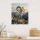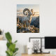 A powerful marble ram stands high on a rocky summit, carved from luminous white stone with subtle grey veining, muscular contours, and finely sculpted spiral horns. Weathered edges and elegant carving marks add the grandeur of ancient monumental sculpture. Golden sunrise light washes over mountain peaks, drifting clouds, alpine grass, and distant valleys, creating a bold scene of resilience and prestige. Ideal for offices, masculine interiors, zodiac décor, collectors, and statement walls inspired by strength and ambition.