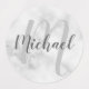 feature personalized name in grey modern script font style and monogram in light grey modern script font style as background