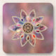 A pale but colourful fractal design like star clouds in outer space or multi-coloured marble with shades of pink, mauve, peach, and blue. The background is a mottled texture like a distant nebula, and the piece is accented by a gold-framed starburst medallion as if inlaid with gold filigree. Completing the picture are smooth opal-like jewels and faceted gemstones inset in a golden floret.