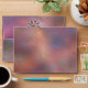 A pale but colourful fractal design like star clouds in outer space or multi-coloured marble with shades of pink, mauve, peach, and blue. The background is a mottled texture like a distant nebula, and the piece is accented by a gold-framed starburst medallion as if inlaid with gold filigree. Completing the picture are smooth opal-like jewels and faceted gemstones inset in a golden floret.