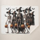 Six skeletons stride forward in eerie unison, each donning a pointed witch hat with orange trim and clutching a pumpkin-shaped bucket. Their poses vary—some jaunty, some solemn—hinting at personalities beneath the bone. Behind them, bats scatter across a dusky sky, adding motion to the spectral procession. Tattered garments and glowing eyes lend a mischievous charm, as if this troupe of the undead is ready to knock on every door between dusk and dawn.