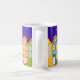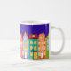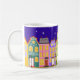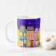 Marcher la nuit Ville Chat Mug. Mignonne ville de nuit avec des maisons de luxe, des fenêtres brillantes, des lampadaires et un chat ambulant. Audacieux, coloré, remarquable.