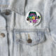 Round button with a festive image of a feathered headdress, feathered masks, a sequined fuchsia hat, beads, purple, green and gold balloons, and two purple amethyst hearts. See the entire Mardi Gras Buttons & Pins collection in the PARTY FAVORS section.