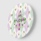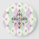 Bright purple and green diamonds overlaid with gold-toned diamond outlines and fleur de lis bring to mind the revelry and celebrations associated with a New Orleans Mardi Gras, while a cream base adds a touch of refinement to this argyle pattern. The pattern is masked behind the silhouette of a fleur de lis to add a fun final note.