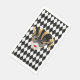 This paper guest napkin is shown in a festive black and white harlequin diamonds print with a Mardi Gras mask print.