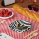 This paper bowl is shown in a festive black and white harlequin diamonds print with a Mardi Gras mask print.