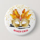 This square button pin is shown with a festive Mardi Gras mask print design.
