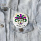 This round button pin is shown with a festive Mardi Gras mask print design.