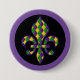 This round button pin is shown with a festive Mardi Gras Fleur De Li print design.