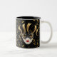 This ceramic coffee mug is shown in a festive Mardi Gras mask print.