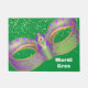 This doormat is shown in green with a gold stars print with a festive Mardi Gras Carnival Mask print.