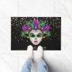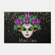 This doormat is shown with a Black coloured background with gold stars with a festive carnival Mardi Gras Mask print.