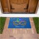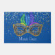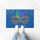 This doormat is shown with a Blue coloured background with gold stars with a festive carnival Mardi Gras Mask print.