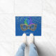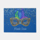 This doormat is shown with a Blue coloured background with gold stars with a festive carnival Mardi Gras Mask print.