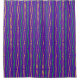 This shower curtain has a geometric Mardi Gras design of sort of flat-ended ovals repeating across the design in gold and green on a field of purple.