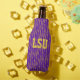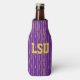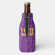 This bottle cooler has a geometric Mardi Gras design of sort of flat-ended ovals repeating across the design in gold and green on a field of purple.