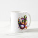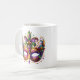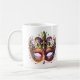 This coffee mug is shown in white with a Mardi Gras mask art print.