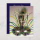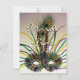 Peinture aquarelle aux petites touches pastel d'un masque Mardi Gras en plumes. Le utilise les couleurs traditionnelles Mardi Gras de violet, vert et or. Deux plumes de paon viennent compléter le masque. Le recto de la carte d'invitation indique "Mardi Gras". Le dos des cartes invitations a "Laissez les bons temps rouler !" comme un espace de salutation pour vous ajouter des détails personnalisés d'invitation de fête carnavalesque. Tous les mots sur la carte peuvent être personnalisés, selon les besoins.