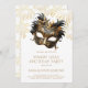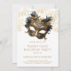 A Mardi Gras masquerade birthday party featuring an elegant mask, and fireworks. Gold and black on white. Perfect for any adult age birthday. Available in print, as a digital download, or both.