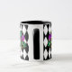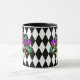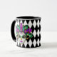 Cette tasse peignée en noir et blanc a l'image d'un masque Mardi Gras festif sur un imprimé motif en diamant noir et blanc. Customisez cet objet ou achetez tel que conçu.